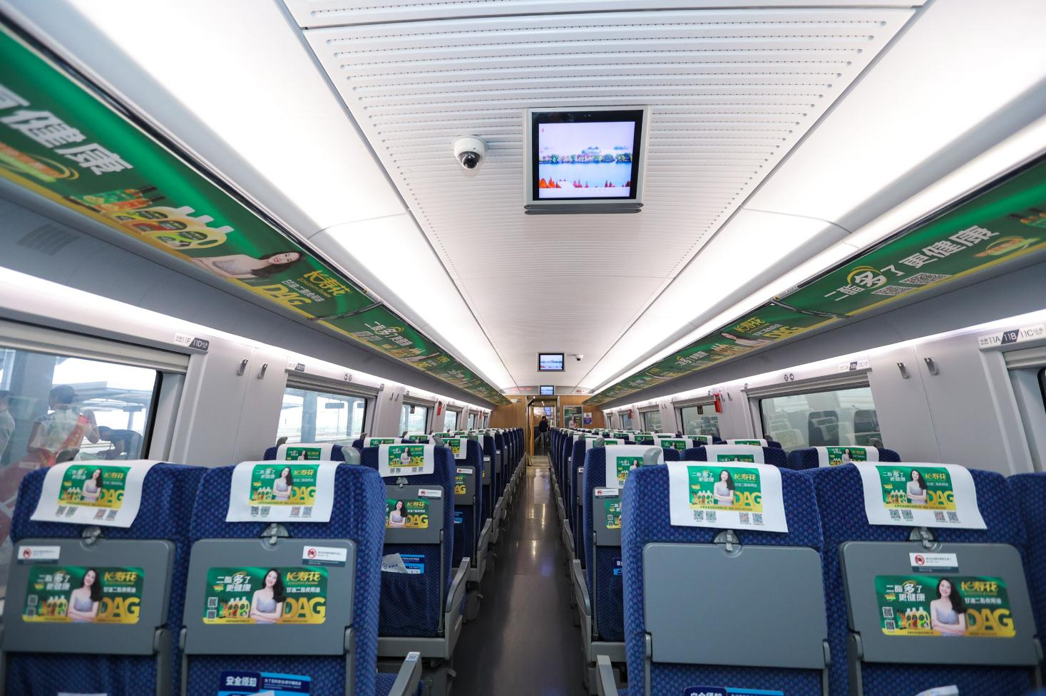 儀式結(jié)束后,與會(huì)領(lǐng)導(dǎo)一行到達(dá)站臺(tái),與“長(zhǎng)壽花甘油二酯食用油號(hào)”高鐵列車(chē)合影,并登上首發(fā)班次冠名列車(chē),實(shí)地感受品牌與高鐵場(chǎng)景的深度融合。列車(chē)內(nèi)部構(gòu)建了以小桌板、頭巾、行李架、海報(bào)、字幕等為點(diǎn)位的品牌傳播矩陣,形成360°環(huán)繞式品牌空間。