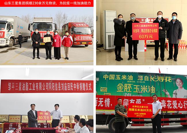 作為根植齊魯大地的“厚道魯商”品牌企業(yè),多年來,山東三星集團主動承擔社會責任, 熱心公益慈善事業(yè)。疫情捐贈、抗洪賑災、捐資助學、扶貧濟困……,在每一個危難的時 刻,在每一處需要幫助的地方,企業(yè)都積極捐款捐物,參與救災和各項社會公益慈善事 業(yè),用實際行動踐行企業(yè)責任,熱心相助,回報社會,多次榮獲“最具愛心企業(yè)”“最具 社會責任感集體”及“慈善之星”等榮譽稱號。此外,山東三星集團每年都積極參與“慈 心一日捐”活動,堅持走訪慰問因病因急致困的周邊群眾及職工,在企業(yè)內部形成了濃厚 的慈善氛圍。