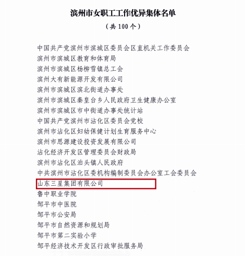 為表彰先進(jìn)、樹立典型,鼓舞激勵(lì)廣大女職工建功新時(shí)代、彰顯新作為,在全市經(jīng)濟(jì)社會(huì)發(fā)展中更好地發(fā)揮“半邊天”作用,近日,濱州市總工會(huì)印發(fā)《濱州市女職工工作優(yōu)異集體和女職工優(yōu)異個(gè)人的通報(bào)》,其中,山東三星集團(tuán)榮獲“濱州市女職工工作優(yōu)異集體”榮譽(yù)稱號(hào),是鄒平市唯一獲評(píng)的企業(yè)單位。