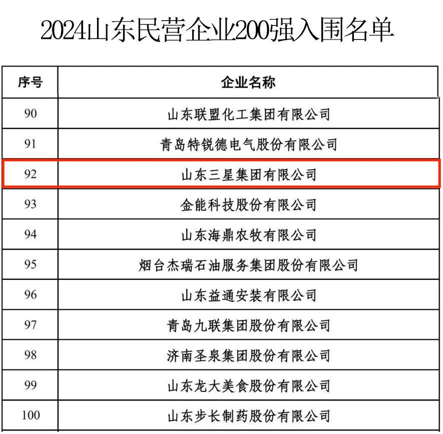 近日,山東省工商聯(lián)公示了2024山東民營企業(yè)百強系列榜單入圍名單。山東三星集團憑借雄厚的產(chǎn)業(yè)實力、強勁的發(fā)展?jié)摿蛷V闊的市場前景,入圍2024山東民營企業(yè)200強名單。