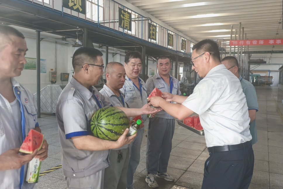 近日,持續(xù)的高溫天氣給堅守崗位的一線員工帶來嚴峻“烤”驗。為切實保障炎炎夏日一線員工身心健康,長壽花糧油加工公司執(zhí)行總經(jīng)理王學(xué)剛、長壽花食品科技公司執(zhí)行總經(jīng)理王奎帶著西瓜、涼茶等降溫物品深入生產(chǎn)車間一線,為員工送去清涼與關(guān)懷。