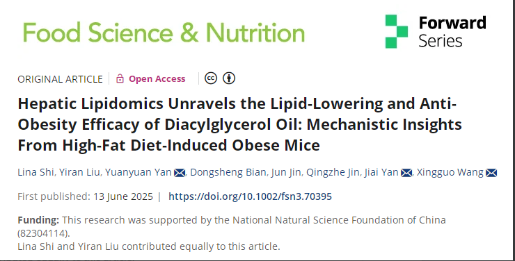 近日,國際權威學術期刊《Food Science & Nutrition》正式刊發(fā)了來自江南大學的團隊對甘油二酯食用油調(diào)控肥胖人群健康功效題為:Hepatic Lipidomics Unravels the Lipid-Lowering and Anti-Obesity Efficacy of Diacylglycerol Oil: Mechanistic Insights From High-Fat Diet-Induced Obese Mice”的最新研究成果。