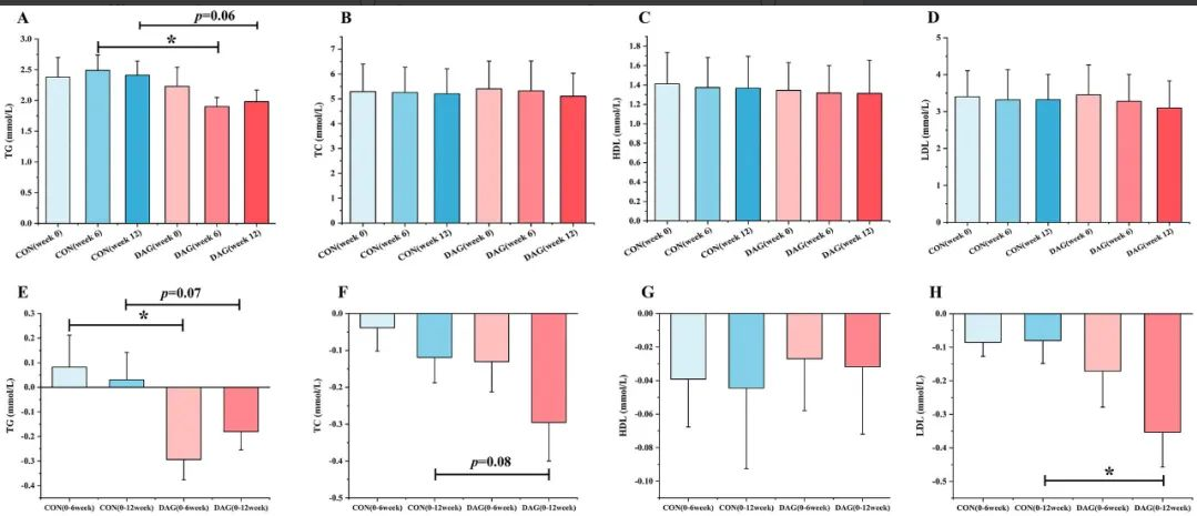 臨床實驗在江南大學附屬醫(yī)院開展,結(jié)果顯示:以甘油二酯食用油替代傳統(tǒng)家庭烹調(diào)用油,干預12周后,受試者的低密度脂蛋白膽固醇(LDL-C)水平相比于對照組(甘油三酯組)出現(xiàn)顯著降低,同時甘油三酯(TG)水平也呈現(xiàn)下降趨勢。